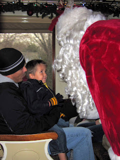 Then they started to play "Santa Claus is Coming To Town". Now, before this has started the lady on the loud speaker said something along the times of "Parents: Listen and you'll understand." Well, this went right over my head- Duh,duh, duh... I just about jumped when I looked up and guess who was there? The big guy in the flesh. We were in the back(? front?) of the train, so we were the first ones he greeted. He was SO NICE! He was super patient and took time to talk to everyone, young and old, on the train!Saying "Hi" To B!